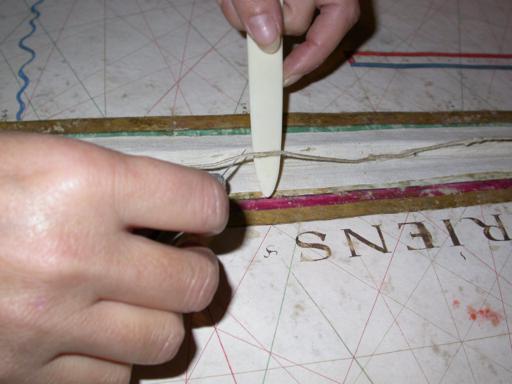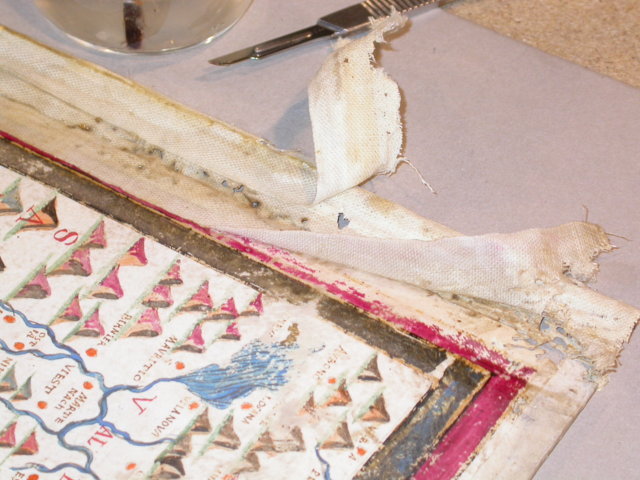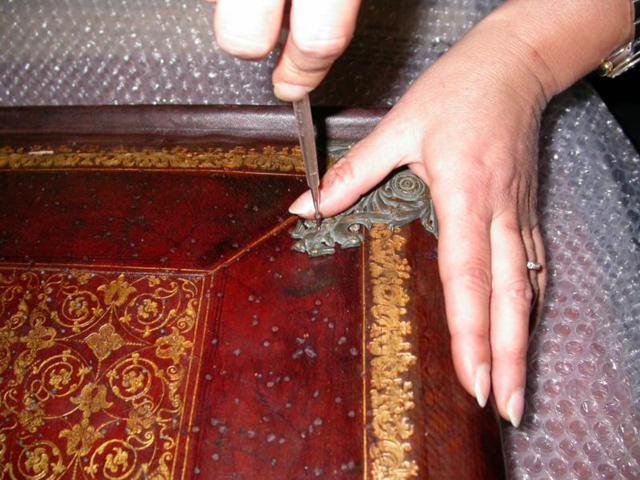 INTERVENTI DI RESTAURO CONSERVATIVO Le carte sono state spolverate con l’ausilio di un pennello a setole morbide; è stata controllata la numerazione delle tavole in previsione dello smontaggio della coperta dal blocco delle carte e della scucitura. La vernice pittorica è stata consolidata con materiali specifici. Le lacune e gli strappi sono stati risarciti con carta giapponese di colore e spessore adeguati. E’ stata inoltre reintegrata cromaticamente la superficie pittorica danneggiata delle tavole mediante l’uso di acquerelli Windsor & Newton. Sono state realizzate nuove brachette che sono state inserite tra la pergamena e il cartoncino della tavola, consentendo un ancoraggio ideale e evitando la sovrapposizione della brachetta sulla pergamena che avrebbe inficiato la leggibilità della tavola stessa e la conservazione del materiale pittorico. E’ stata realizzata una nuova cucitura, come originale, ed una nuova indorsatura. La coperta è stata pulita mediante l’uso di bisturi a lama fissa e batuffoli di cotone imbevuti in soluzione specifica. Il rigonfiamento presente sulla controguardia è stato eliminato. E’ stato eseguito il restauro e la reintegrazione delle lacune della coperta e sono stati riempiti i fori di tarlo più profondi con polpa di carta giapponese. Le componenti metalliche di chiusura mancanti sono state rifatte simili all’originale, realizzandole in ottone con ricostruzione a disegno di perimetro. E’ stato inoltre confezionato un contenitore rigido per la conservazione in legno, rivestito in tela.
