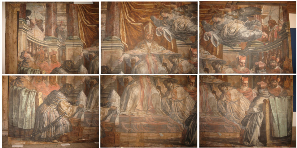 Di seguito sono presentate delle immagini relative a 3 cartoni preparatori custoditi presso la Galleria Nazionale di Arte Antica - Palazzo Barberini in Roma. Le condizioni inziali delle opere sono seguite da quelle attuali, risultato di un lungo e paziente intervento di recupero conservativo. Clicca sull'immagine per ingrandirla.