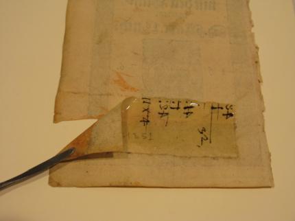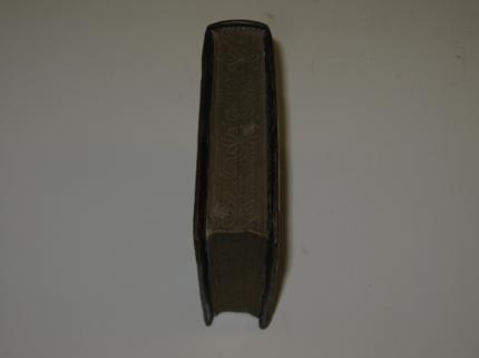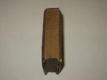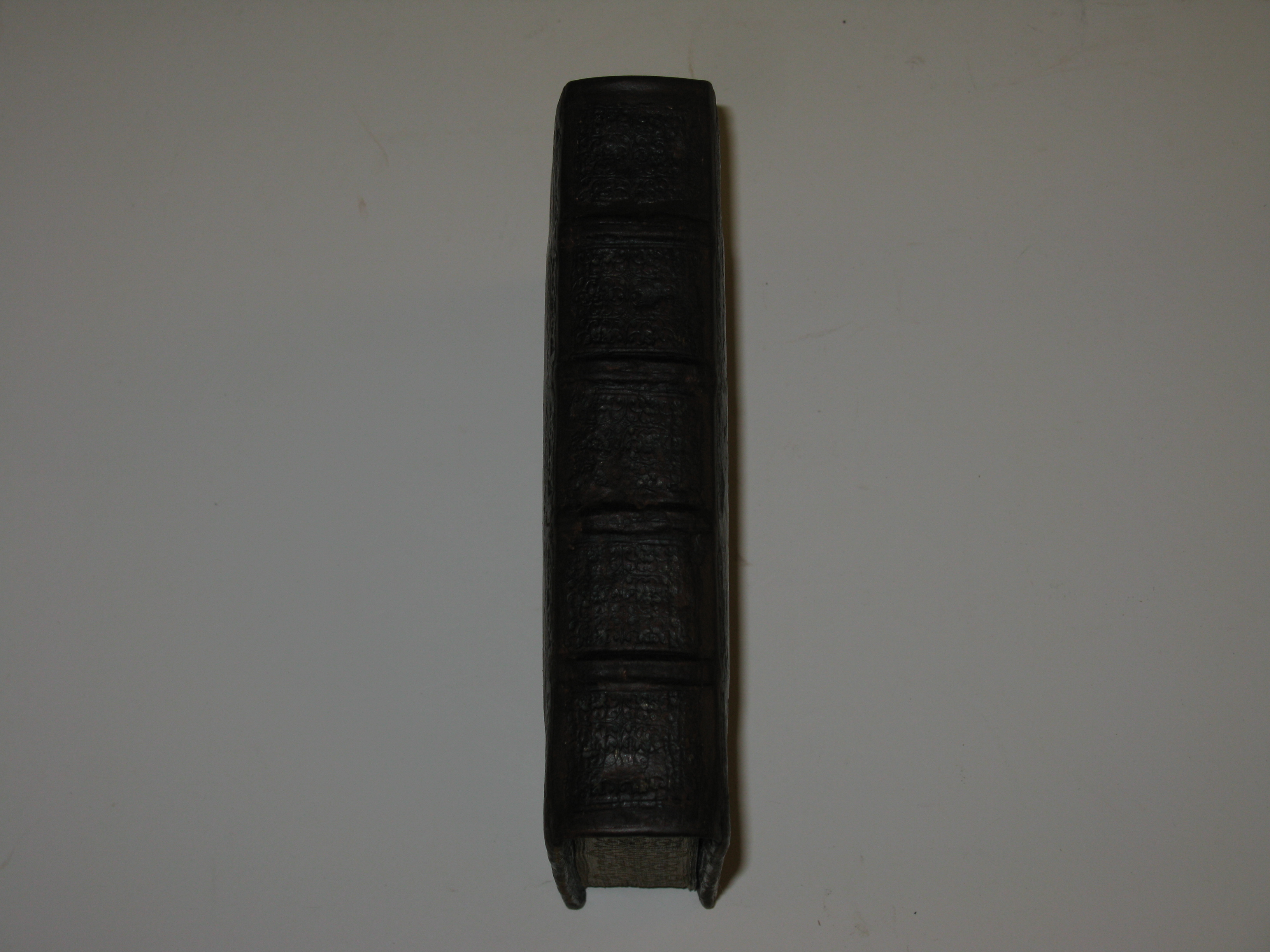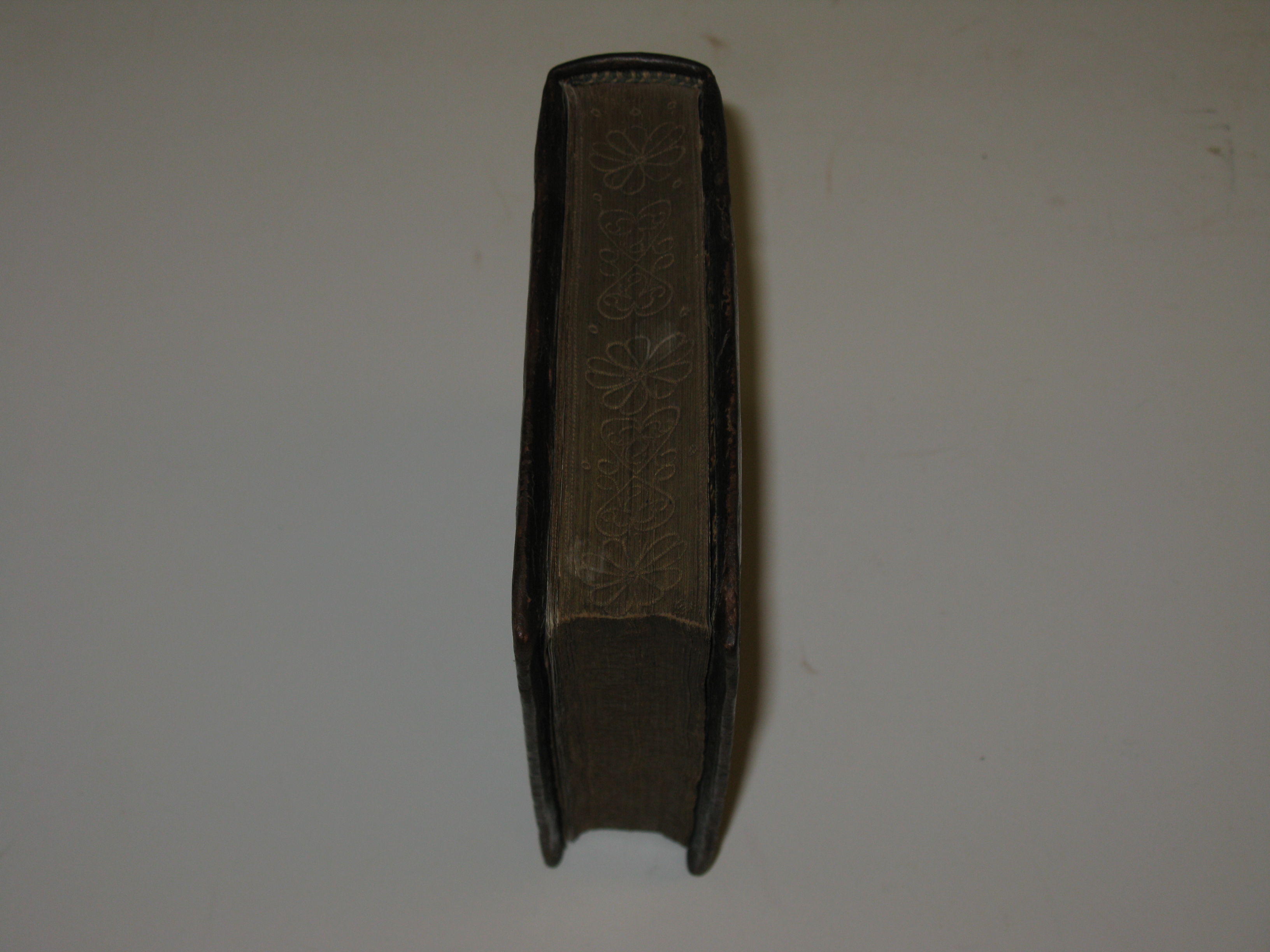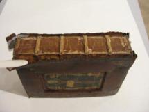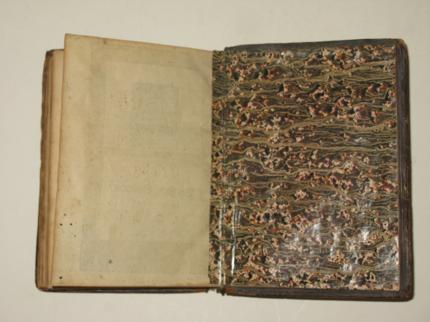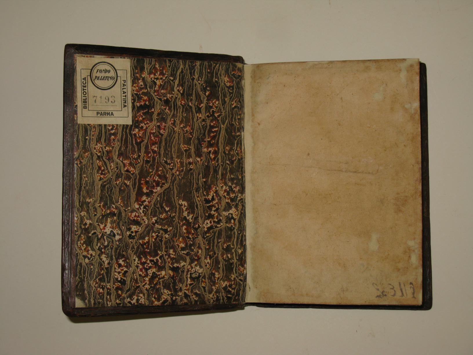 INTERVENTI DI RESTAURO CONSERVATIVO - Depolveratura del volume con pennello a setole morbide. - Distacco della controguardia anteriore mediante leggera umidificazione a tampone. - Distacco della controguardia originale, presente sotto quella decorata, mediante leggera umidificazione a tampone. - Distacco del primo fascicolo mediante taglio del filo. - Risarcimento delle lacune con carta giapponese di adeguato spessore - Riposizionamento del primo fascicolo mediante cucitura in filo di lino. - Riposizionamento della controguardia originale, prima del frontespizio, mediante brachetta in carta giapponese. L’ex libris posizionato sulla controguardia originale, è stato ricollocato nella posizione originale mediante una brachetta in carta giapponese. - Rinverdimento della coperta in pelle con prodotti a base di cere naturali. - Distacco del dorso originale mediante taglio delle cerniere. - Consolidamento dei capitelli. - Consolidamento dell’indorsatura originale con caselle in carta giapponese con prolungamenti utilizzati per rinforzare l’aggancio del piatto anteriore. - Realizzazione di un nuovo dorso in pelle di capra conciata al vegetale. Applicazione del dorso originale sul nuovo - Consolidamento della coperta nelle zone maggiormente danneggiate. - Risarcimento delle lacune sulla coperta con carta giapponese di adeguato spessore. - Adeguamento cromatico dei risarcimenti sulla coperta di restauro con colori a base vegetale e acquarelli. - Condizionamento del volume in un contenitore rigido per la conservazione preesistente. DURANTE IL RESTAURO